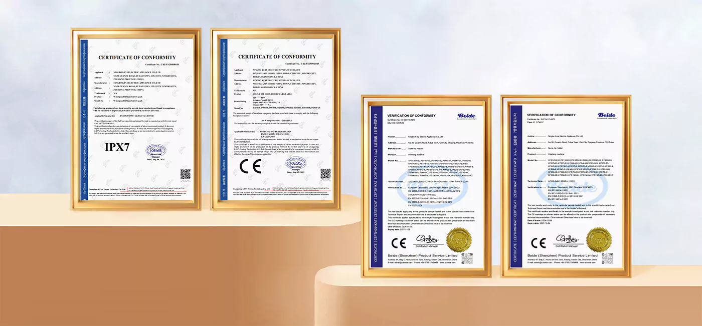 Наши стиральные машины и воздухоохладители прошли испытания по стандартам ЕС и получили сертификат CE. Аккумулятор имеет класс водонепроницаемости IPX7. Мы также сертифицированы как выдающиеся продавцы на отечественных платформах электронной коммерции и Alibaba.